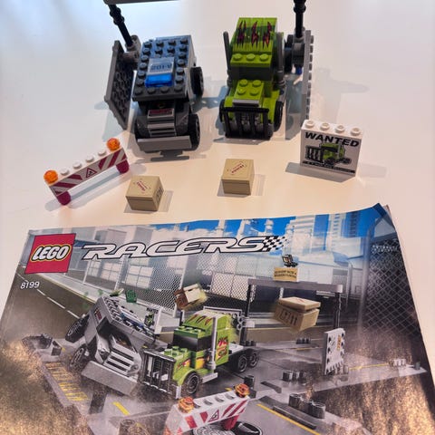 LEGO City LEGO Racers bilsett inkluderer en lastebil og en racerbil med tilhørende skilting og rekvisitter. Settet er en del av LEGO City-serien og egner seg for bygging og lek med kjøretøy og bytema.