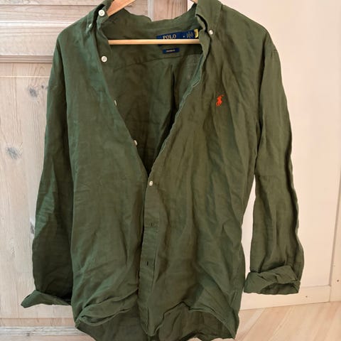 Ralph Lauren Custom Fit skjorte i lin, størrelse M. Skjorten har hvit farge med stripete grønt mønster og er laget i linmateriale.