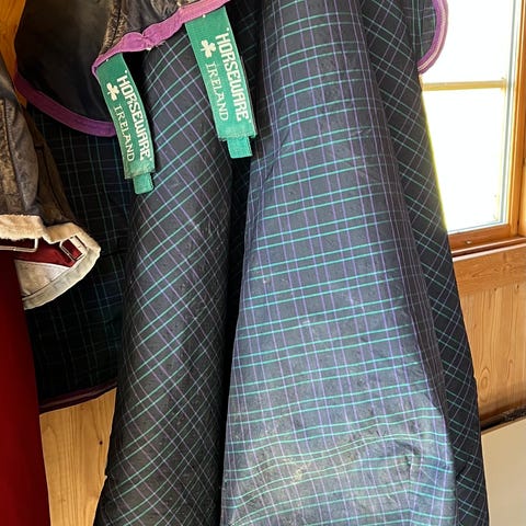 Horze 100g dekken, brukt litt en vinter, fast hals ene ringen til borelåsen på halsen ble ødlagt, kjøpte ny og delte den for å få den i uten å ta opp noen søm. Har teipa den med gafateip å den har fungert slik. Se bilde