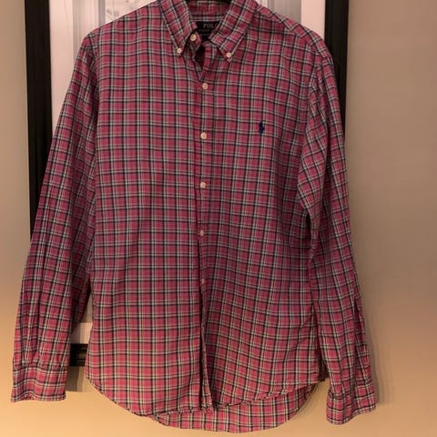 Ralph Lauren Custom Fit skjorte i størrelse M for menn. Skjorten er laget av lin og har en grønn farge. Passer til bruk som hverdags- eller fritidsplagg.