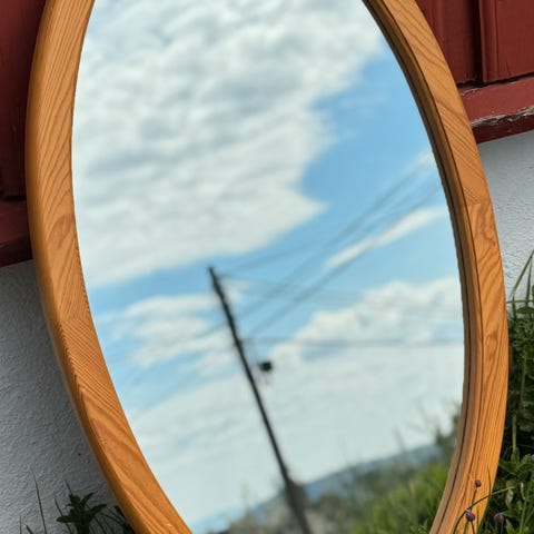 Vintage speil i god kvalitet med ramme i tre. Speilet har et enkelt design med en ramme i tre som passer til ulike interiørstiler. Egnet for bruk i hjemmet, for eksempel i gang, stue eller soverom. Speilet er ca. 150 cm høyt og 40-50 cm bredt.
