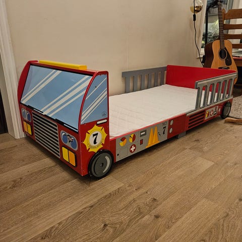 McQueen barneseng. Fine sengemål: 140x70 cm madrass, 171x75 cm bil. Sengen er i god stand, men viser tegn på slitasje. Kjempe fint tilstand. Vi selger pga flytting. Madrass også som ny. Fordi vi ikke brukt.
