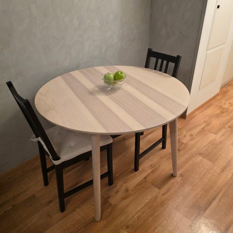 Selger et rundt spisebord, hvit topp med trebein. Vi har vært svært fornøyd med bordet, stilfullt og enkelt å tørke av. Perfekt for 4 stoler.