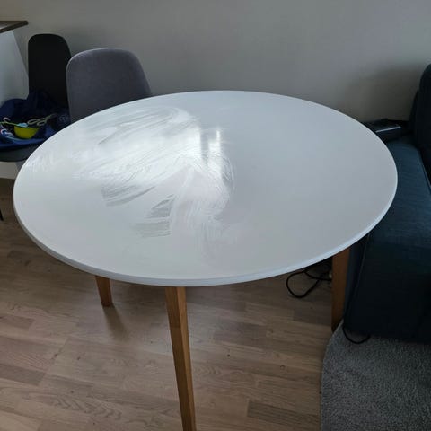 Det er noen små bruksmerker rundt bordplaten, se bilde. Dette har ingenting å si for bruken. Selges grunnet familieforøkelse og vi trenger et større bord. Selges uten stoler.