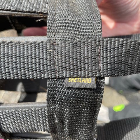 Hööks grime i brunt skinn med hvite sømmer og gullfargede metallspenner. Grimen har justerbare stropper for tilpasning. Brukt kun 2 ganger.