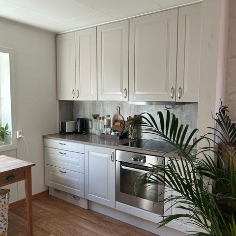 HTH kjøkkeninnredning med hvite skapdører og benkeplate. Kjøkken er allerede demontert - kjøper må kun komme og hente. Hvitevarer og ventilator følger ikke med. Frontene er så og si plettfrie og ble godt tatt vare på under demontering, stammene har naturligvis merker og hull fra strøm/ vann/skuer/hvitevarer. Alt er helt komplett med unntak av at det mangler en liten list som skulle lagt under benkeplate bak vask-døra. Den kan enkelt erstattes. Kjøkken selges som det er - kom og se.