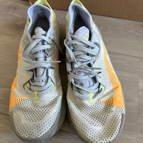 Nike Pegasus Trail løpesko i størrelse 43. Skoene har en kombinasjon av materialer som gir god pusteevne og slitestyrke. Designet for terrengløping med godt grep på sålen og demping i mellomsålen. Fargen er hovedsakelig burgunder med gule og oransje detaljer.