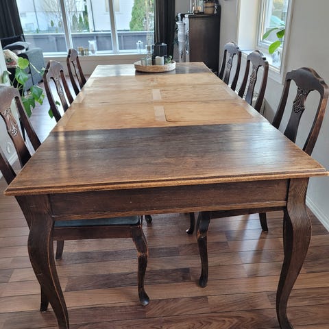 Godt og solid spisebord med 6 stoler. Medfølger 2 stk innleggsplater.