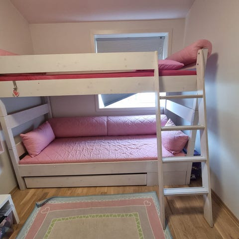 Madrasser følger med, men madrassen i overkøya er noe nedligget. Selges til rett under halv pris av nypris.