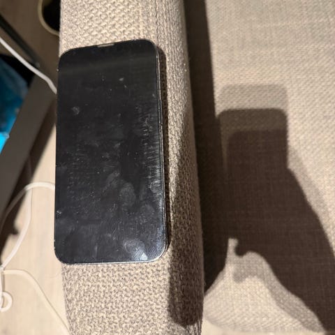 Apple iPhone 13 Pro mobiltelefon med 256 GB lagringskapasitet. Enheten har en skjerm med trippel kameraoppsett på baksiden. Fargen er lys, nærmest gullfarget. Skjermen er intakt, men bakdekselet har sprekkdannelser i glasset. Telefonen leveres uten ytterligere tilbehør.