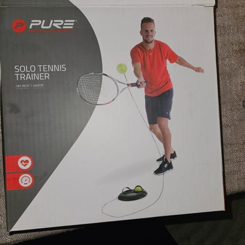 Pure Solo Tennis Trainer treningsutstyr for tennis. Produktet brukes til å trene tennisferdigheter ved å slå ballen mot en elastisk snor festet til en base, som returnerer ballen til spilleren. Egnet for individuell trening og forbedring av teknikk.