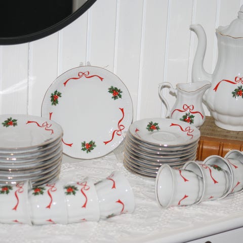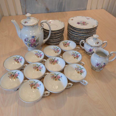 Kaffekanne, sukkerskål, fløtemugge og kakefat