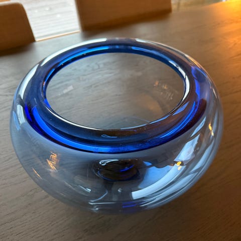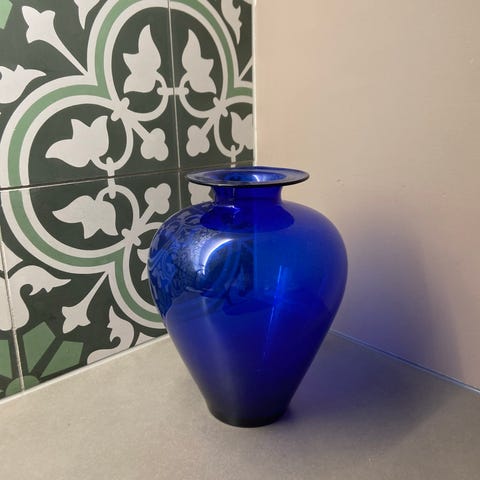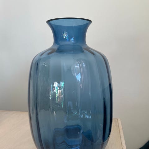 H&M Home dekorasjonsvase i blått glass. Vasen har en rund form med dekorative mønstre. Diameter ca. 23 cm, høyde ca. 18 cm.