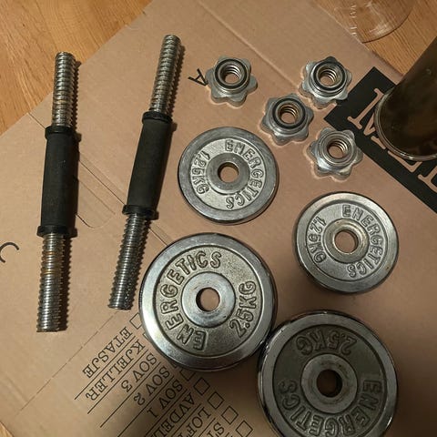 Domyos manualvekter med vekt på 5 kg per manual. Manualene er svarte og har sekskantet form for stabilitet ved plassering på gulv. Egnet for styrketrening og generell fitness.