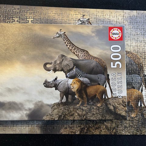 Puslespill med 500 brikker med motiv av forskjellige dyr i naturen, inkludert elefant, panda, løve gorilla flamingo og sebra. Egnet for voksne og barn som liker puslespill og dyremotiver.