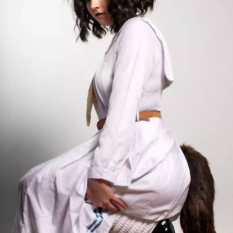 Str S/ liten M. Ikke verdens beste kvalitet, men helt grei til utkledning. En perle knapp på siden har falt av- kan sys på og følger med
