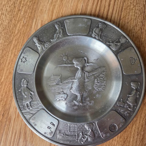 Dåpsfat i tinn, dåpsramme i tinn fra Eik barn. Tekst: o du som metter liten fugl. Ble dessverre aldri brukt. Har bare lagt i esken så det er helt fint. Bare plastlokket på esken som viser at det har lagt 10- 12 år i skuffer og skap :)