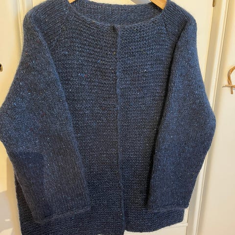 Lys blå hjemmestrikket lang cardigan. Det er også strikket et belte som ikke er med i den opprinnelige oppskriften. Myk ull som muligens kan være alpakka?