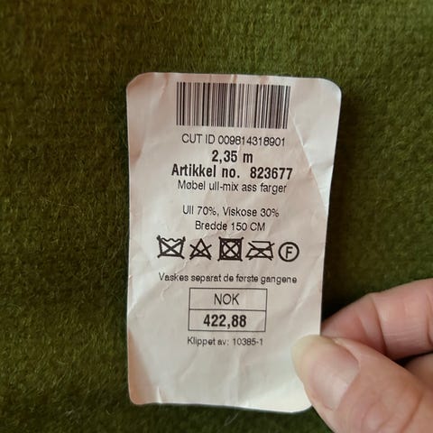 Lappen sa det var 170x240cm men det er altså målt til 175x240. Tenk det. (Bilde av lappen er fra internettet da jeg klippet bort lappen til eget bruk.