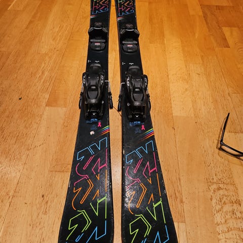 K2 twin-tip på 129 cm. Skiene er brukt to sesonger. Noen bruksmerker.