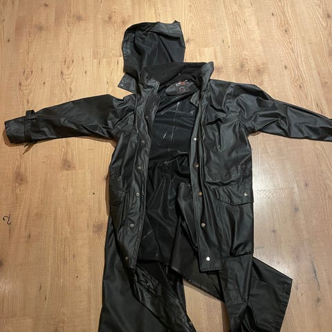 Regnkåpe, str L/40, holde beina, salen og litt av hesten tørr, pustende for, gode lommer. Veldig god lang ridekåpe, selges hbo 500kr