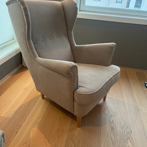 IKEA ørelappstol i flott, turkis stoff med høy rygg og knappedetaljer. En veldig stor og god stol. Den turkise fargen er utgått og finnes ikke lenger i butikk.