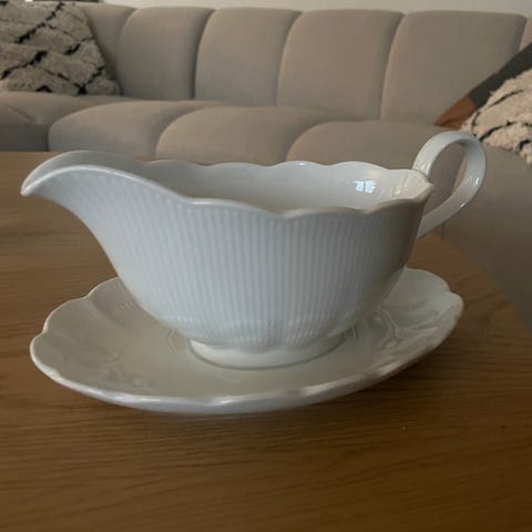 Fem serveringsfat / deler selges samlet. Alt er helt, men bortsett fra det største fatet så er de kjørt i oppvaskmaskin og derfor er gullborden falmet.