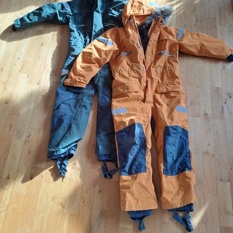 Ett sett foret Didrikson regnsett (jakke og bukse) en Didrikson turbukse, en HH turbukse (begge i vannavvisende stoff), samt en tykkere jakke fra Reima (str 128).