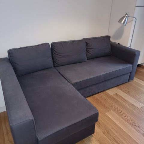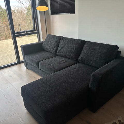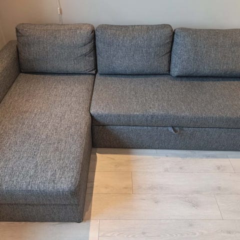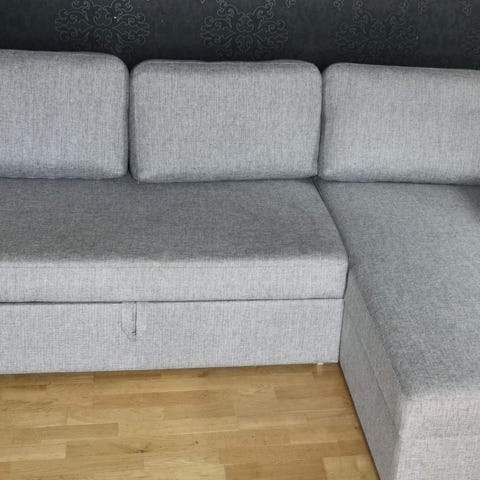 Grå hjørnesofa med sjeselong og sovefunksjon. Noen bruksmerker.