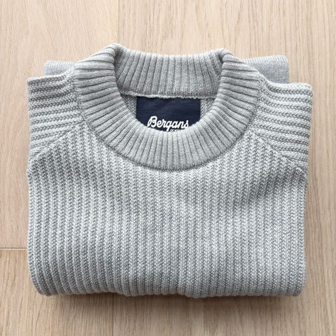 Bergans genser i oransje, størrelse S, laget av merinoull. Genseren er designet for kvinner og har et mønster i hvitt over bryst og skuldre. Materialet gir varme og komfort, egnet til bruk i kaldere vær.