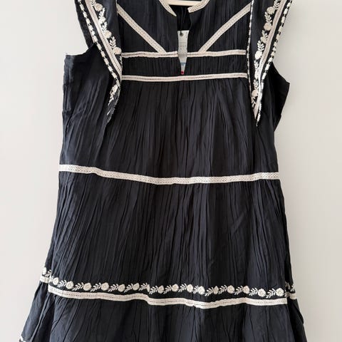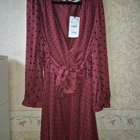 Selger en ny og ubrukt svart kjole fra Zara, ideell for både festlige anledninger og elegante hverdager. Kjolen har lange ermer med puffede mansjetter og tre dekorative knapper som gir et sofistikert uttrykk. Stoffet har en lett glans og føles behagelig mot huden – laget av 72 % polyester, 23 % viskose og 5 % elastan for god passform og komfort.