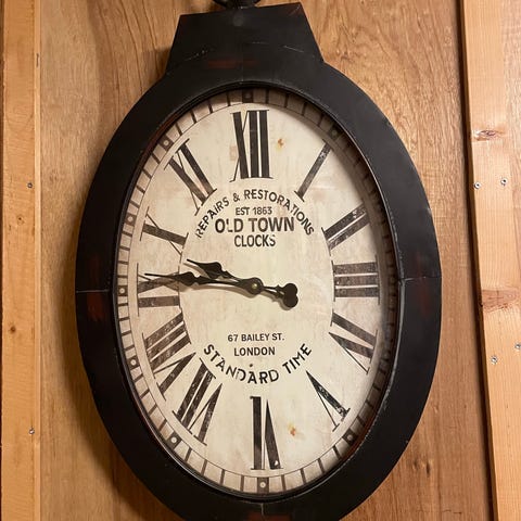 IKEA veggur med rund form og hvit urskive. Klokken har svart tall og visere, samt en mindre sekundviser i en egen sirkel. Ytre ramme i metall med en ring for oppheng.