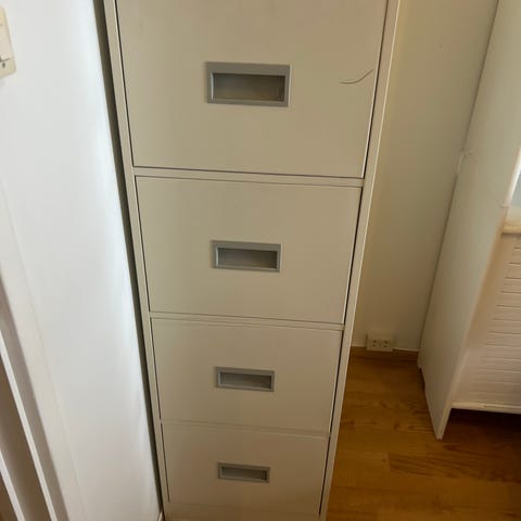 Arkivskap i metall med tre skuffer, grå farge. Egnet for oppbevaring av dokumenter og filer, med hengemapper i skuffene. Praktisk for kontor eller hjemmekontor.