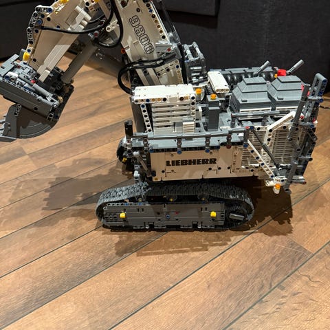 LEGO Technic Liebherr R 9800 gravemaskin med detaljerte funksjoner og bevegelige deler. Modellen er laget i plast og inkluderer motoriserte komponenter som kan styres via app. Passer for bygging og samling, egnet for barn og voksne med interesse for tekniske modeller.