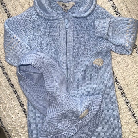 Lillelam ulldress i størrelse 62 med matchende lue (størrelse 44-46) og votter, alt sammen i 100 % merinoull. Dressen har glidelås foran og strukturert strikkemønster. Luen har knyting under haka og dusk, vottene har tomler.
