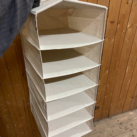 Hengende oppbevaring med 4 hyller og 1 skuff. Perfekt hvis du trenger flere hyller til brettede klær i f.eks. skapet ditt.