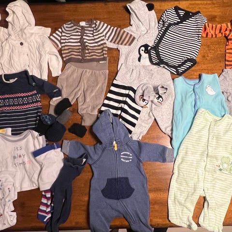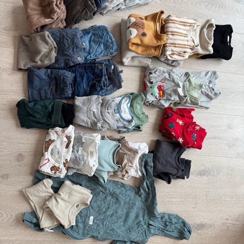 Stor klespakke til gutt, mest fra Hennes og Mauritz. 8 heldresser, 10 bodyer, 8 bukser