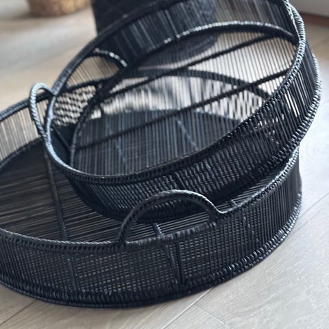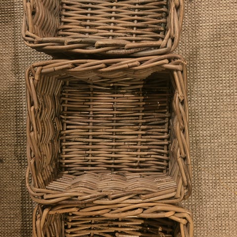 Kurv laget i rotting med lokk og metallbeslag. Kurven har et naturlig fargeuttrykk og er egnet til oppbevaring. Lokket er festet med remmer og metallbeslag for stabilitet.