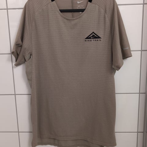 Nike Trail T-skjorte for herre i størrelse S. T-skjorten er rød og laget med Dri-FIT materiale, egnet for løping.