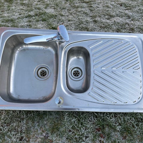 Dobbel vask i rustfritt stål med to kummer og integrert avrenningsfelt. Passer til kjøkkenbruk, laget for enkel rengjøring og holdbarhet.