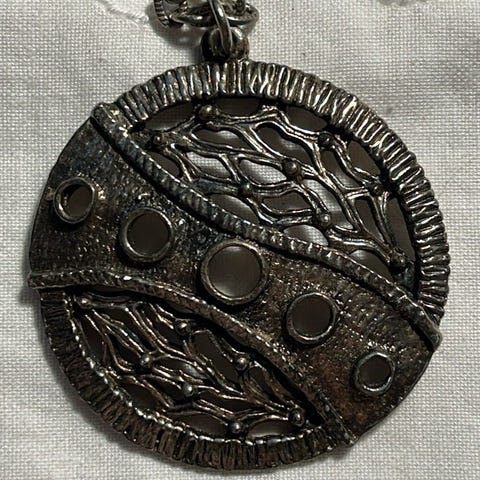 Vintage halskjede i tinn og med blå smykkesten selges for 250,-