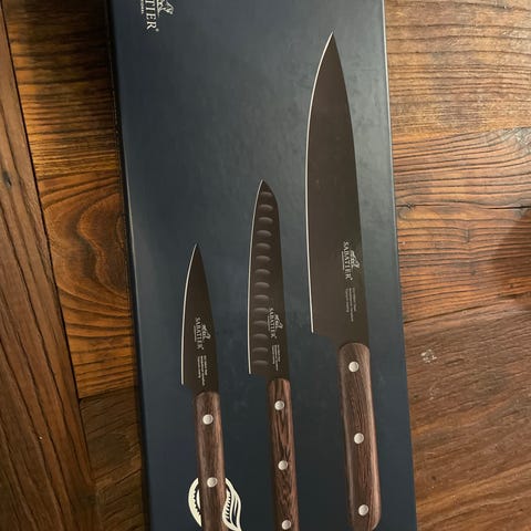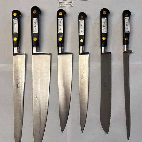 Sabatier kokkekniv i rustfritt stål med sort håndtak. Kniven har en lang bladform som egner seg til ulike kjøkkenoppgaver som kutting, hakking og skjæring av matvarer. Knivbladet kommer i det som fremstår for meg som en spesialutgave, med 30cm knivblad (jeg finner den ikke tilgjengelig for salg noe sted). Knivens totale lengde er 43 cm. Utgaven på 25cm koster omtrent 1700kr på nett. Kniven er pent brukt og profesjonelt slipt.