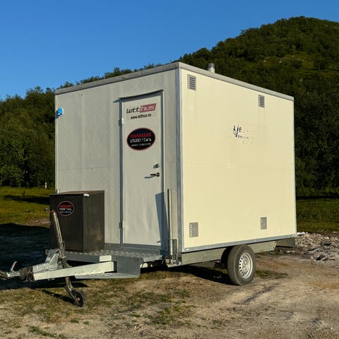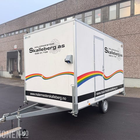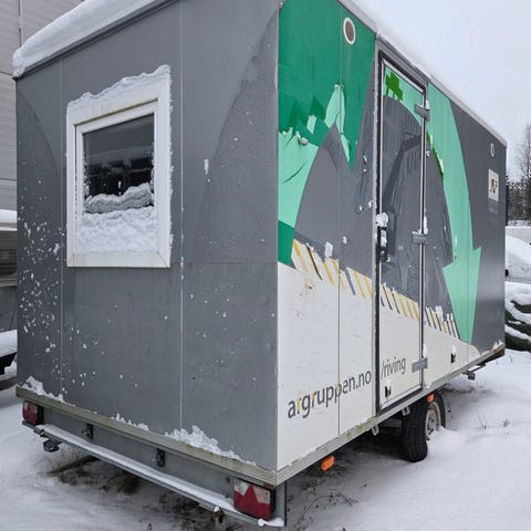 Flyttbar brakke med tilhengerfeste. Brakken har en dør, vindu og ventilasjon, og er utstyrt med takluke og elektrisk belysning innvendig. Egnet for midlertidig opphold eller bruk som arbeidsbrakke. Selges HBO prisantydning. Eventuelt bud