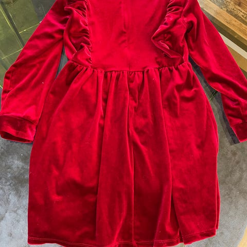 H&M julekjole til barn i størrelse 122/128, laget av polyester. Kjolen er rød med hvite detaljer, inkludert pelskant på krage, ermer og nederst på kjolen. Passer for jenter. Pent brukt.
