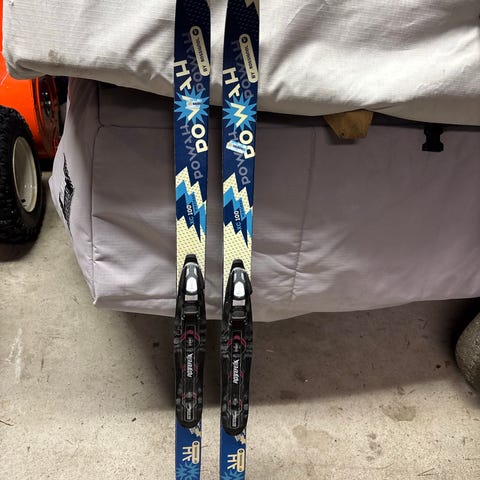 Nybegynnerski, skal være anti-bakskli. Skistaver 75 cm, skisko str 33.