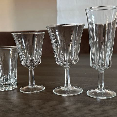 Klassiske vinglass i klart krystallglass med stjernemønster. Merket "France" under.