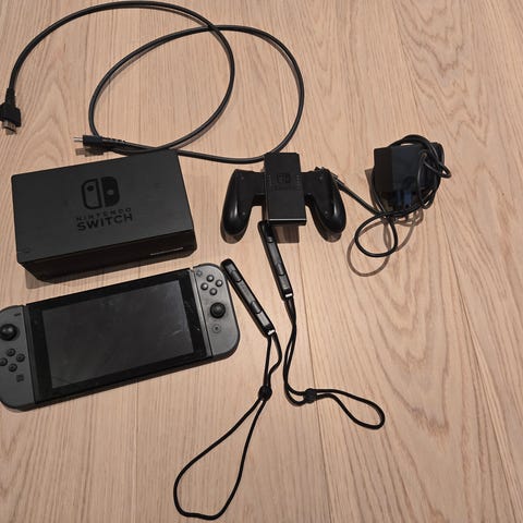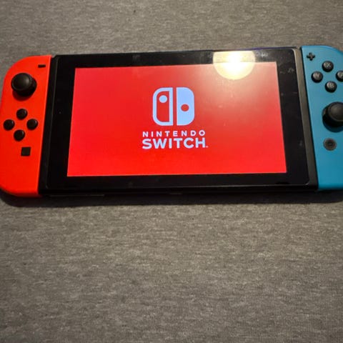 Nintendo Switch spillkonsoll med tilhørende lader og bæreveske. Konsollen har avtakbare Joy-Con-kontrollere i rød og grå farge. Enheten kan brukes både som håndholdt konsoll og koblet til TV. Det er drift i spakene på Joy-Con-kontrollene. Ellers fungerer alt som det skal.