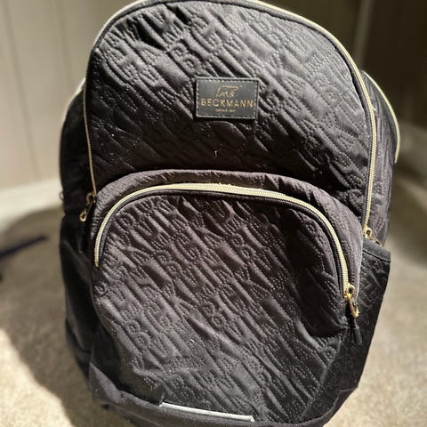 Liten Beckmann-sekk, med regntrekk og bakkenett til en ball. Super-praktisk og god kvalitet. Godt brukt, men hel og fin.