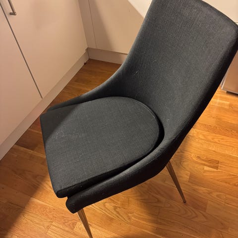 6 spisestuestoler med kaffebrunt trekk i imitert skinn gis bort mot henting. Stolene er pene å se på, og gode å sitte i. Det er også lett å tørke bort / vaske overflaten dersom noen søler litt, men trekket er ikke avtagbart. Bena er i brunsvart tre. Det er noe riper og hakk på enkelte stolben som lett kan fikses med litt farget beis eller olje.