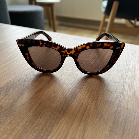 Stilige og elegante solbriller med lilla gradient-glass i sort blank ramme med fine gulldetaljer. Klassisk cat-eye / oval fasong som passer perfekt til både hverdags og sommerantrekk. Pent brukt, ingen riper i glassene og sitter komfortabelt.